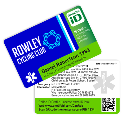 The key feature is that each ID card is custom designed in club or organization colours. Users can record up to 10 lines of information providing room for multiple emergency contacts, medical conditions, allergies, treatment instructions and medication. Plus every OneLife iD includes the online ID profile, which can be accessed from the card with the unique web address or by scanning the QR code. The online ID profile is great for adding extra information and can be changed whenever details change.